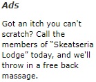 Welcome to the Skeatseria Lodge, the guild made for those heroes who truly know the deeper meaning of life in Godville: drinking alcohol! Being a member of our guild means that one has to support the purchase, drinking, and general wasting of money on any and all types of alcoholic beverages. We don't care about our members alignment nor do we do care about our members individual goals. So long as you continue to visit at least one pub each and every time you visit any town, you will fit in perfectly at the Skeatseria Lodge! New members are encouraged to post at our Forum Headquarters to say hello and get involved in guild activities. And all members are encouraged to use Invites to Godville to friend other members of the guild found either at the aforementioned forum headquarters to create more unity within our guild and keep our guild active and rising in the Pantheon of Unity!