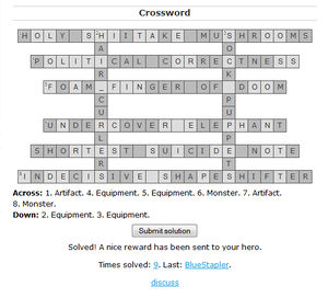 For those having trouble completing the crossword without assistance, hints and guidance can be found on this forum thread. Additionally, the lists of Artifacts, Auras, Equipment, Monsters, Boss-Monsters, Skills, Locations, and Towns (or the Omnibus List, combining all of these in one place) may provide some assistance in finding a correct answer. If an answer looks correct, but is not, a god may wish to replace a space with a hyphen or an underscore. Hyphens and underscores are also regularly found between the first and second words of three word answers. Lastly, if all else fails, using a crossword helping website like http://www.crosswordsolver.org might help.