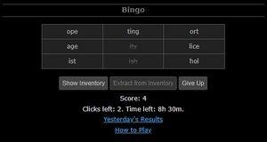 The Bingo is a grid with three or four letters in each cell. It is played by clicking the "Show Inventory" button to show the contents of the hero's inventory.